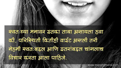 स्वतःच्या मनावर इतका ताबा असायला हवा की,परिस्थिती कितीही वाईट असली तरी नेहमी स्वतःबद्दल आणि इतरांबद्दल चांगलाच विचार करता आला पाहिजे.